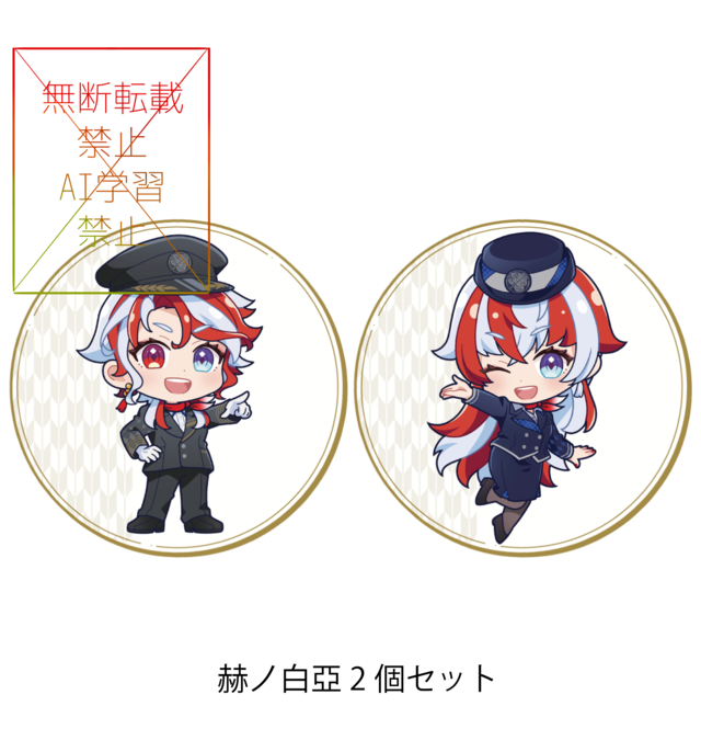 指定した出演者のミニキャラ缶バッチ2個 1セット サイズ 57mm×57mm ※イベント前のグッズ到着をご希望の方は1月24日23:59までにご購入お願いします。 それ以降の購入に関してはイベント前のグッズ到着に間に合わない可能性があります。